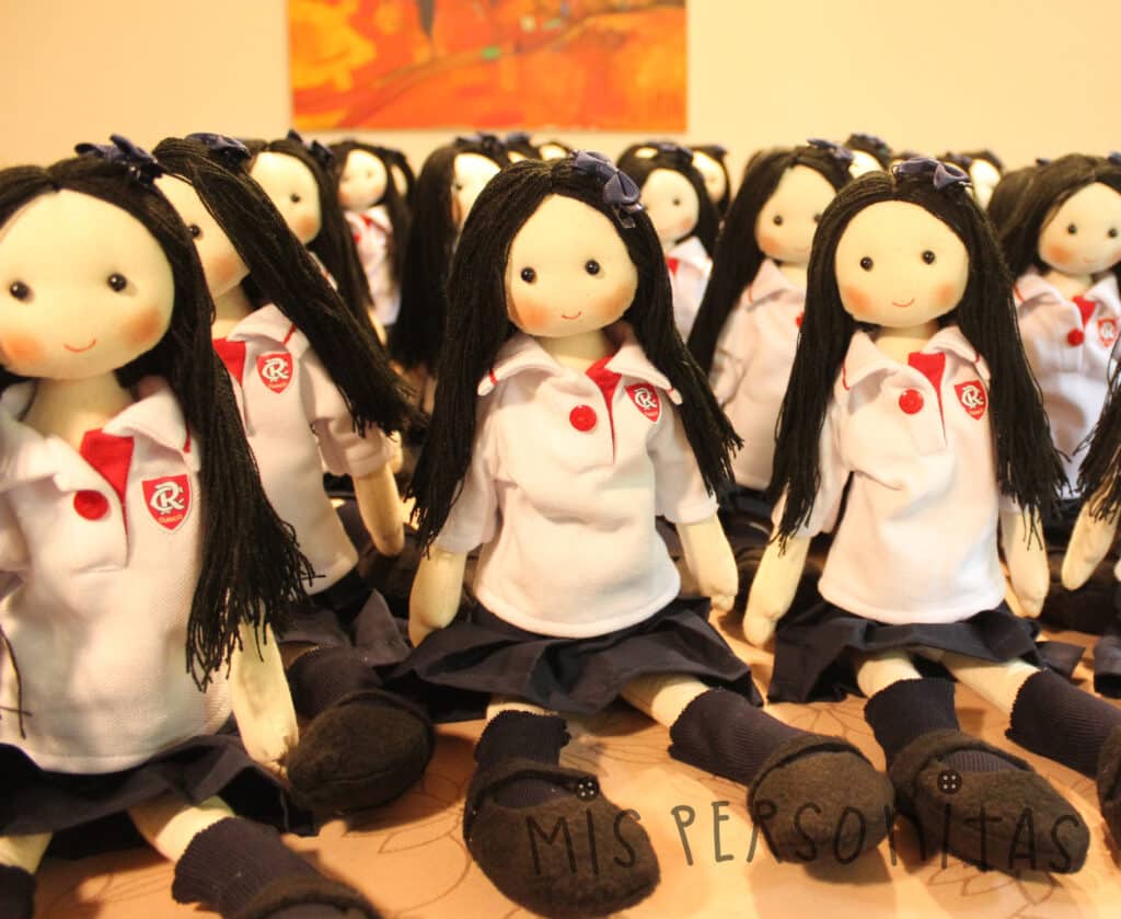 Para la confección de los uniformes de escolares Mis Personitas se utilizan telas de algodón, poliéster, casimir y polar. Las muñecas y muñecos miden aproximadamente 50 Cms. Se realizan en un patrón común, se personaliza el uniforme, color y forma de pelo, color de ojos e insignia.